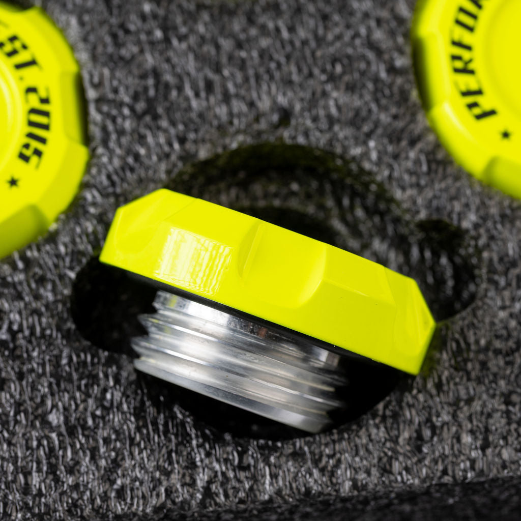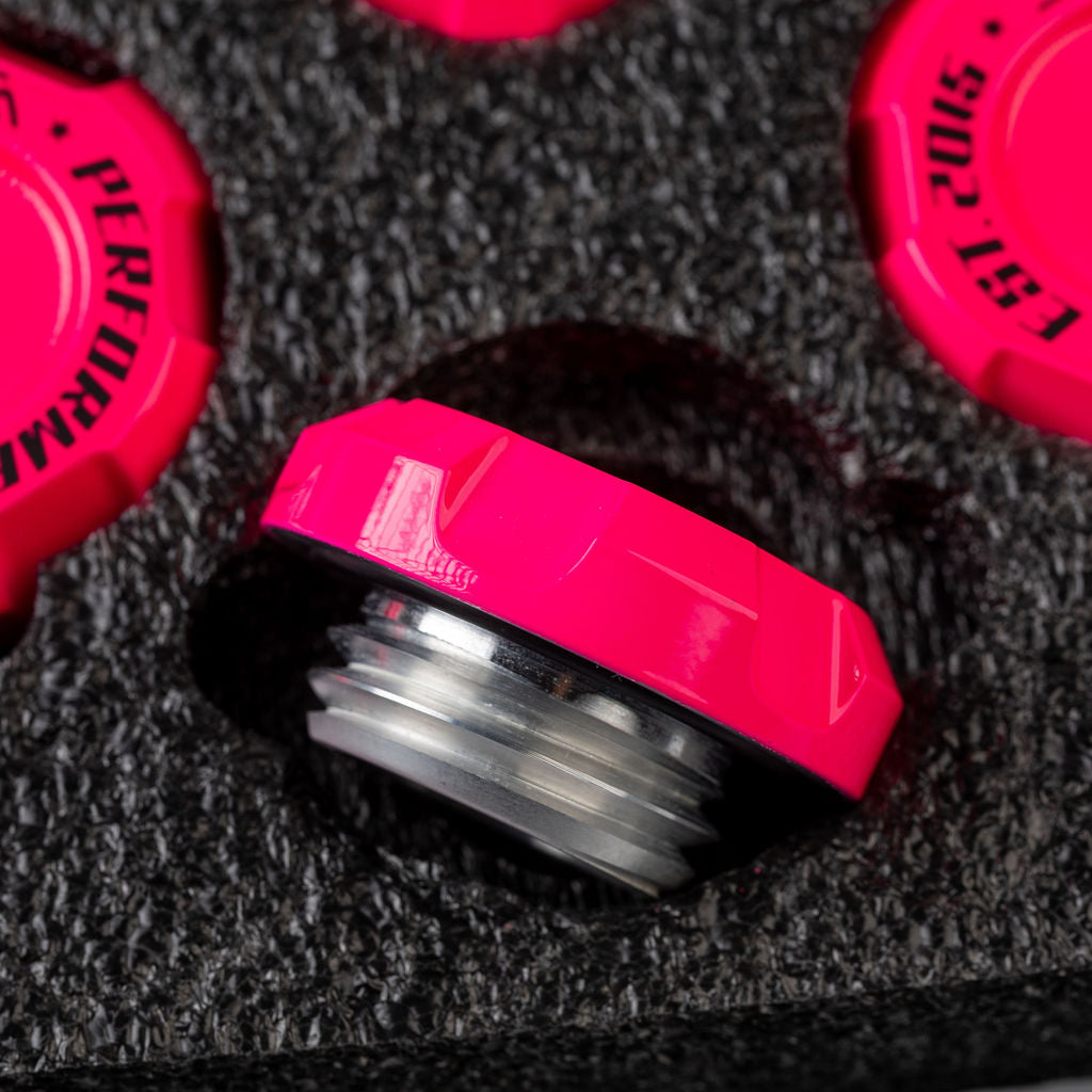 This four-cap set—covering oil, coolant, wiper fluid, and brake fluid—creates a unified, polished engine bay aesthetic that elevates both stock and modified builds.